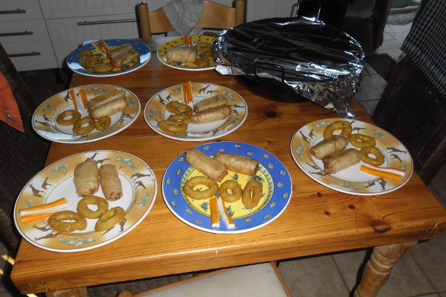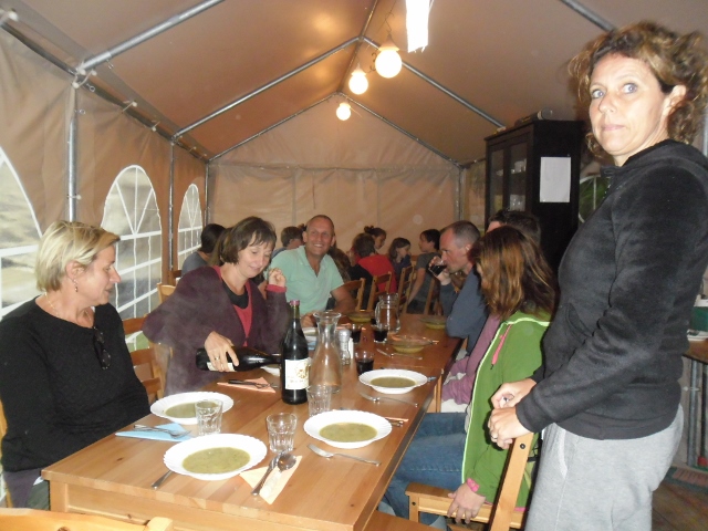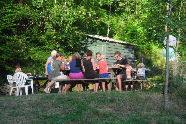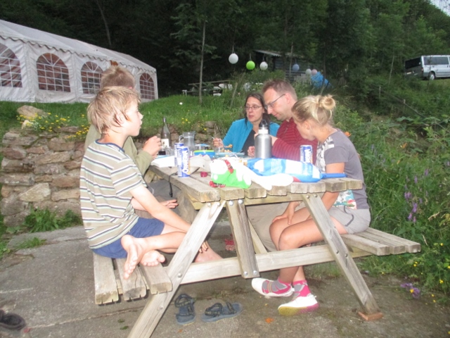 Het avondeten start meestal om half 8 en gebeurt in de partytent of aan de picknick tafels die buiten zijn opgesteld. Dit is een beetje afhankelijk van het weer.